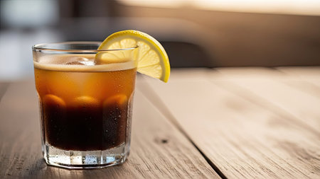 glass of iced cola with lemon on wooden table in cafe