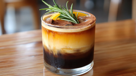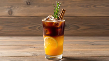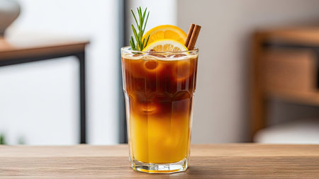 A layered iced Americano black coffee with citrus juices, rosemary sprigs, and cinnamon, served on a wooden table for a cozy, stylish look.
