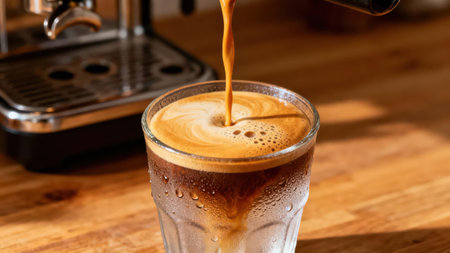 Golden brown espresso shot dripping from a portafilter spout into a cold, ribbed glass with condensation, contrasting the dark coffee below and the light crema on a wooden surface.