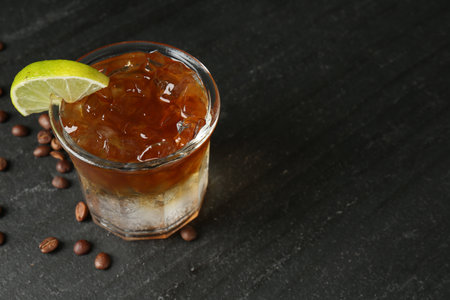 Refreshing espresso tonic drink with slice of lime and coffee beans on dark table, closeup. Space for text