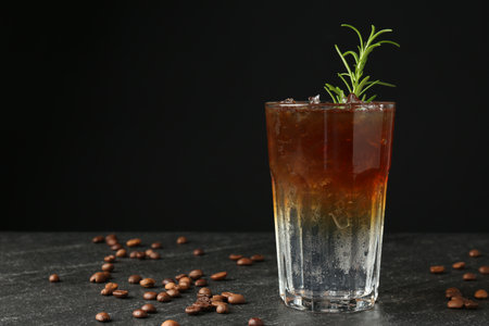 Refreshing espresso tonic drink with rosemary and coffee beans on dark table. Space for text
