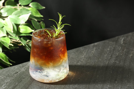 Refreshing espresso tonic drink with rosemary on dark table. Space for text