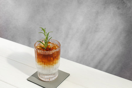 Refreshing espresso tonic drink with rosemary on white table