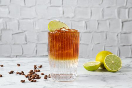 Refreshing espresso tonic drink with lime and coffee beans on white marble table