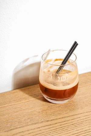 Cold Brew coffee on wooden table. Social media food trends.