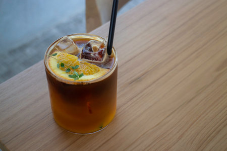 Iced black orange coffee on wooden table, stock photo