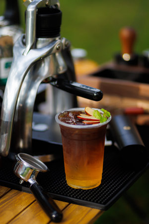 A close-up view of a refreshing iced Americano garnished with citrus slices and aromatic spices, perfect for a summer drink. Enjoy its rich flavor!