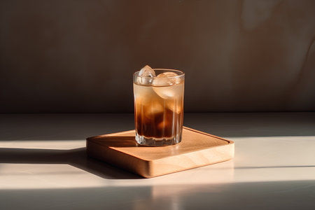glass of iced tea with ice cubes on wooden tray in sunlight