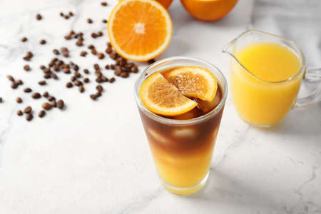 Glass of tasty coffee with orange juice on light background