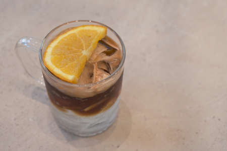 Iced coffee mixed with orange juice for healthy drinking on wood saucer