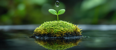 Droplet floating above a tiny island of moss, reflecting natures delicate balance