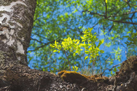 Plant grows on the root of the birch tree. green foliage