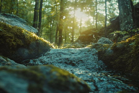 Serene summer forest scene featuring a stream, mossy stones, and play of sunlight and shadows