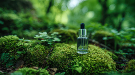 Reflecting Natures Essence: A Glass Dropper Bottle on Lush Green Moss in a Forest Setting Surrounded by Vibrant Flora and Soft Sunlight