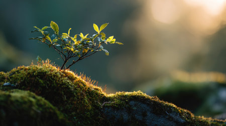 Photo of a small Elm growing on moss at sunrise, symbolizing hope and new beginnings. Web banner with copy space on the right for product placement.
