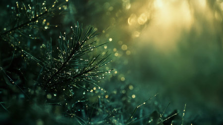Gentle sunlight filters through a misty forest, illuminating dewy pine needles. The image captures the essence of tranquility and natural beauty, perfect for evoking serenity.