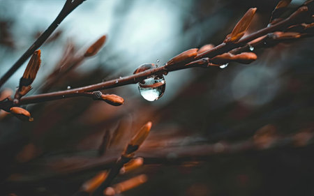 Water drops on tree branch in the rainy twilight. Bokeh background. Natural outdoor concept. Macro.