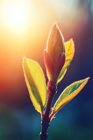 Spring Awakening Green Leaves and Bud Unfurling on Branch in Warm Sunlight, Nature Background