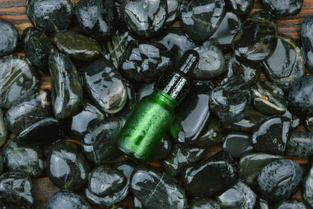 Cosmetics bottle package container on natural background, Skin care on shiny black stone, Moisturizing and dry damage care concept.