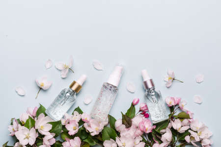 Set of cosmetic liquid gel products and flowering apple twig border on blue