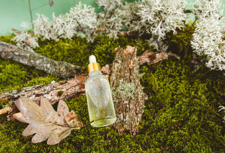 Natural eco-friendly organic cosmetics on the background of moss, leaves and tree bark.