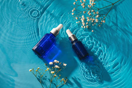 Set of skin care products in the blue vials and tonics and lotions. Pastel colored display. Cosmetics and body care backgrounds