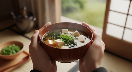 Close-up of hands holding a wooden bowl of miso soup with tofu, seaweed, and scallions, bathed in soft, natural light near a window. A comforting, traditional Japanese meal.