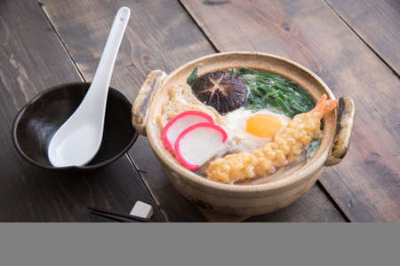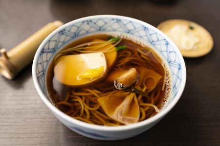 Traditional Japanese food style. Selective focus. Copy space. Bowl of Asian style soup with green tea soba noodles on wooden table.