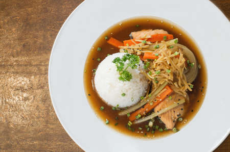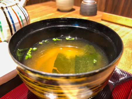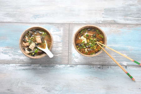 bowl of miso soup on a wooden background. Traditional oriental cuisine