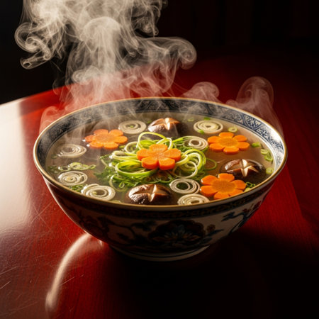 Steaming bowl of soup sits on wooden surface, with wisps of steam rising into air. rich colors and warm light create cozy atmosphere, inviting you to enjoy this comforting dish
