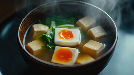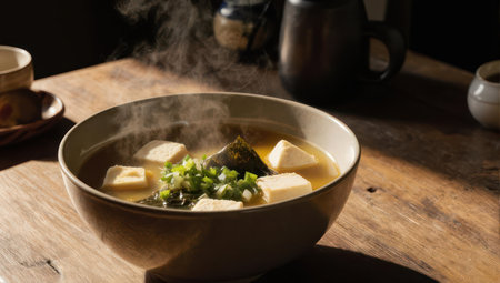 Steaming bowl of traditional japanese miso soup, rich with cubes of tofu and fresh green onion, served on a rustic wooden surface. warm, comforting, and healthy asian cuisine.