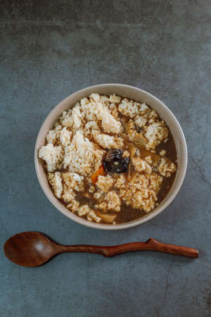 Top view of delicious tofu and century egg soup with coriander in Taiwan.