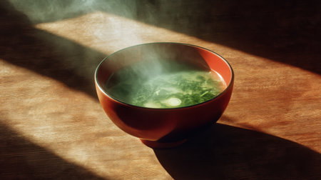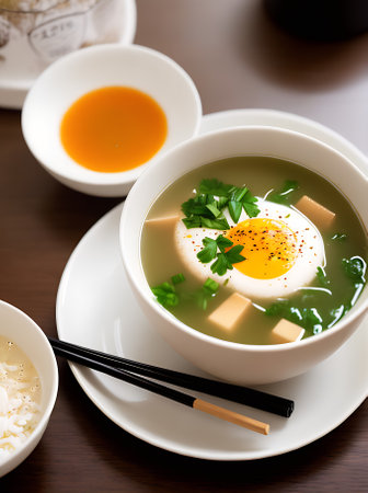 Realistic miso soup with neutral colors warm lighting highly detailed cozy atmosphere restaurant scene with nobody captured in an extreme long shot. Generative AI Generated