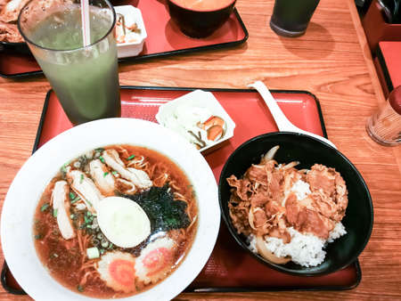 Japanese lunch meal in the tray. Ramen soup and gyudon.