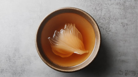Braised shark fin soup served in a minimalist dish, the clear broth and fins highlighted on a grey background. -