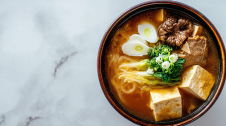 A vibrant bowl of ramen featuring tender beef, soft tofu, and fresh scallions, served on a marble surface. Ideal for culinary photography and food blogs.