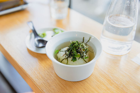 Detailed cozy restaurant with warm lighting and neutral tones serving realistic miso soup with an extreme long shot and no people. Generative AI Generated