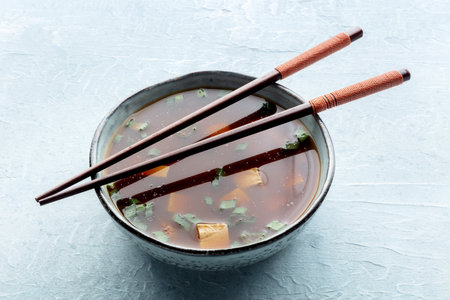 Tofu soup, Japanese cuisine. Miso soup with bean curd and spring onions, with chopsticks