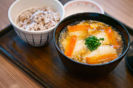 Close up Japanese vegan food, fresh soft tofu in egg soup and vegetables, mini rice bowl, food on wooden tray at table's resturant.