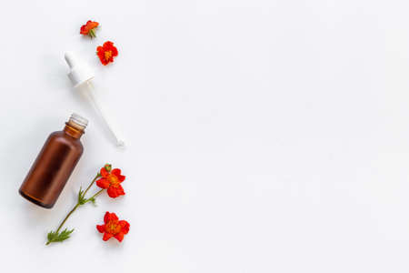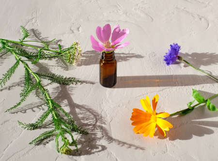 Aromatherapy bottle and flowers on white textured background as naturpathy concept