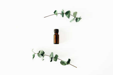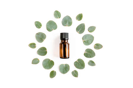Abstract composition. Round wreath frame made of leaf eucalyptus in the middle of an essential oil isolated on white background. lay flat, top view
