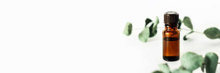 A bottle of fragrant cosmetic or essential oil on a white background surrounded by sprigs of eucalyptus.