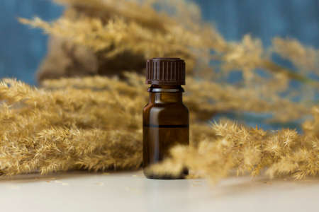 a bottle of cosmetic oil on a background of pampas grass on a colored background and a stone. Stylish appearance, layout, personality. Banner, a place for the text. Background for advertising and presentation.