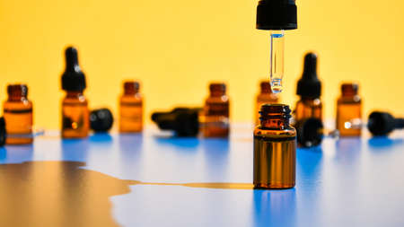 Eye dropper bottles with dark shadows on yellow and blue background. Modern creative minimalism concept. Copy space