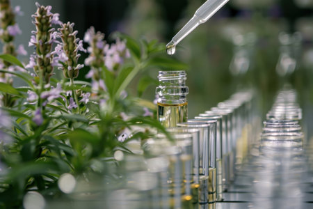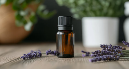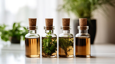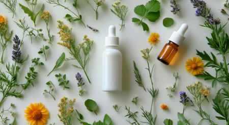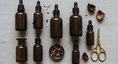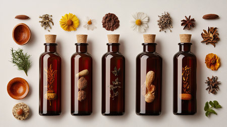 A visually appealing arrangement of glass bottles filled with natural herbs and ingredients, surrounded by flowers and spices, perfect for wellness and beauty themes.