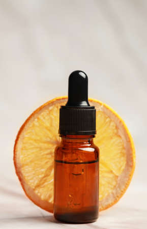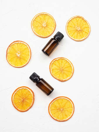 Eco-friendly cosmetics and aromatherapy concept. Top view of organic essential oil with slices of dried orange. Natural cosmetics product. Glass containers with liquid.