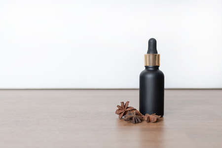 black Cosmetic bottle with pipette near star anise on white and wooden background.