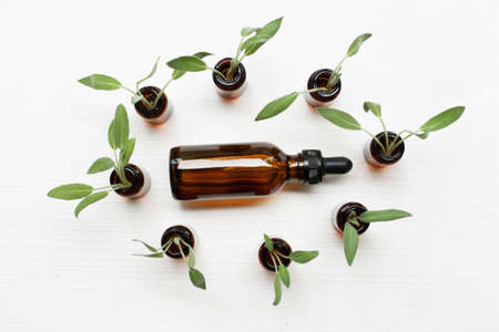 Natural sage essential oil with sage leaves on white blackground.