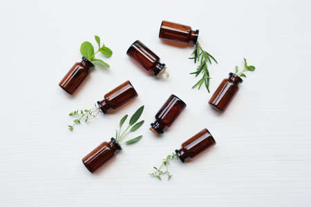 Essential oil in glass bottles with fresh herbs on white table.