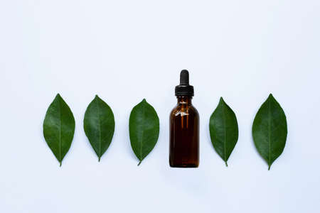 Essential oil bottle with green leaves on white background. Copy space